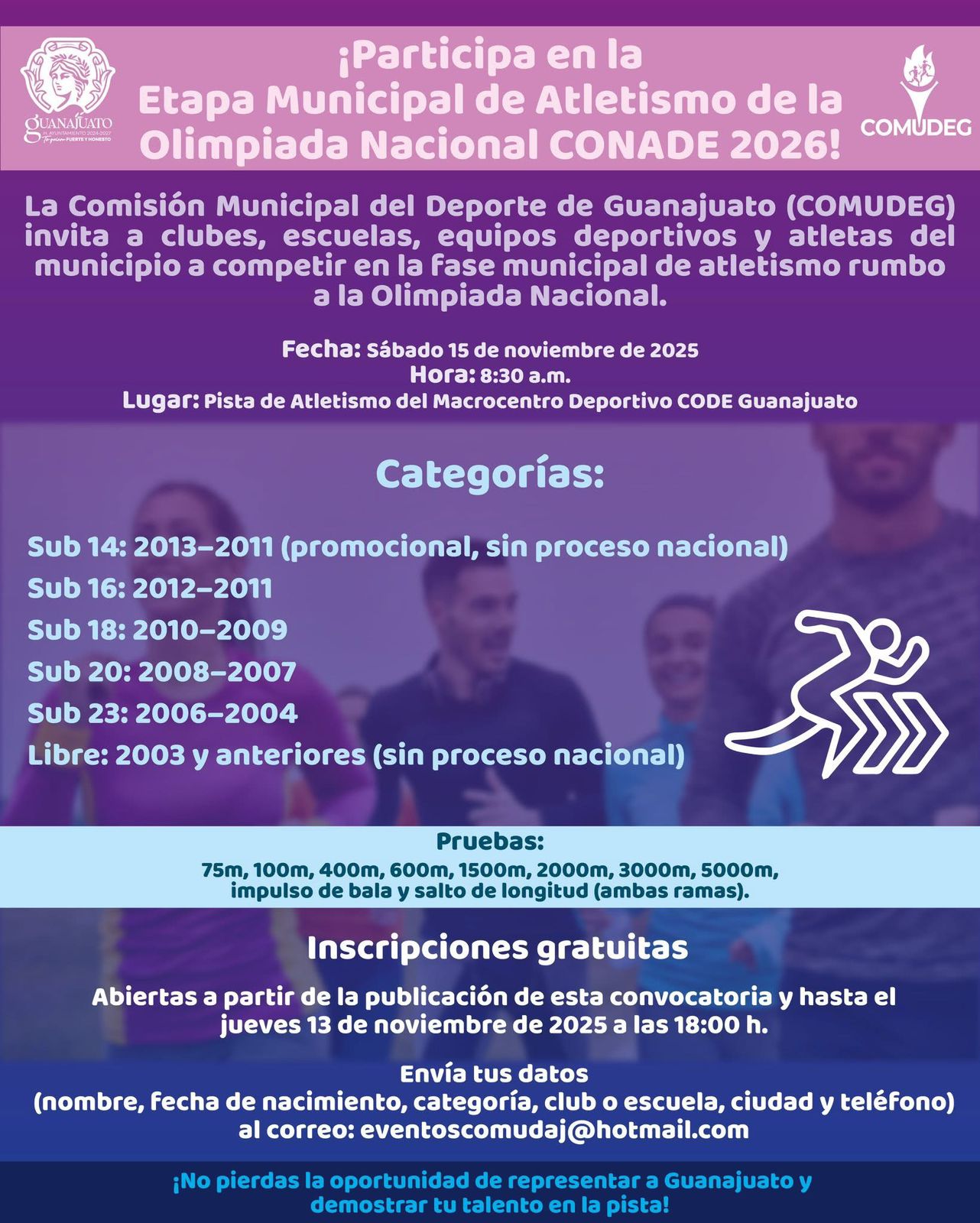 Guanajuato, Guanajuato.- La Comisión Municipal del Deporte de Guanajuato (COMUDEG) lanzó la convocatoria para participar en la Etapa Municipal de Atletismo rumbo a la Olimpiada Nacional CONADE 2026. La competencia se realizará el sábado 15 de noviembre de 2025 a partir de las 8:30 de la mañana en la pista de atletismo del Macrocentro Deportivo CODE Valenciana Guanajuato.