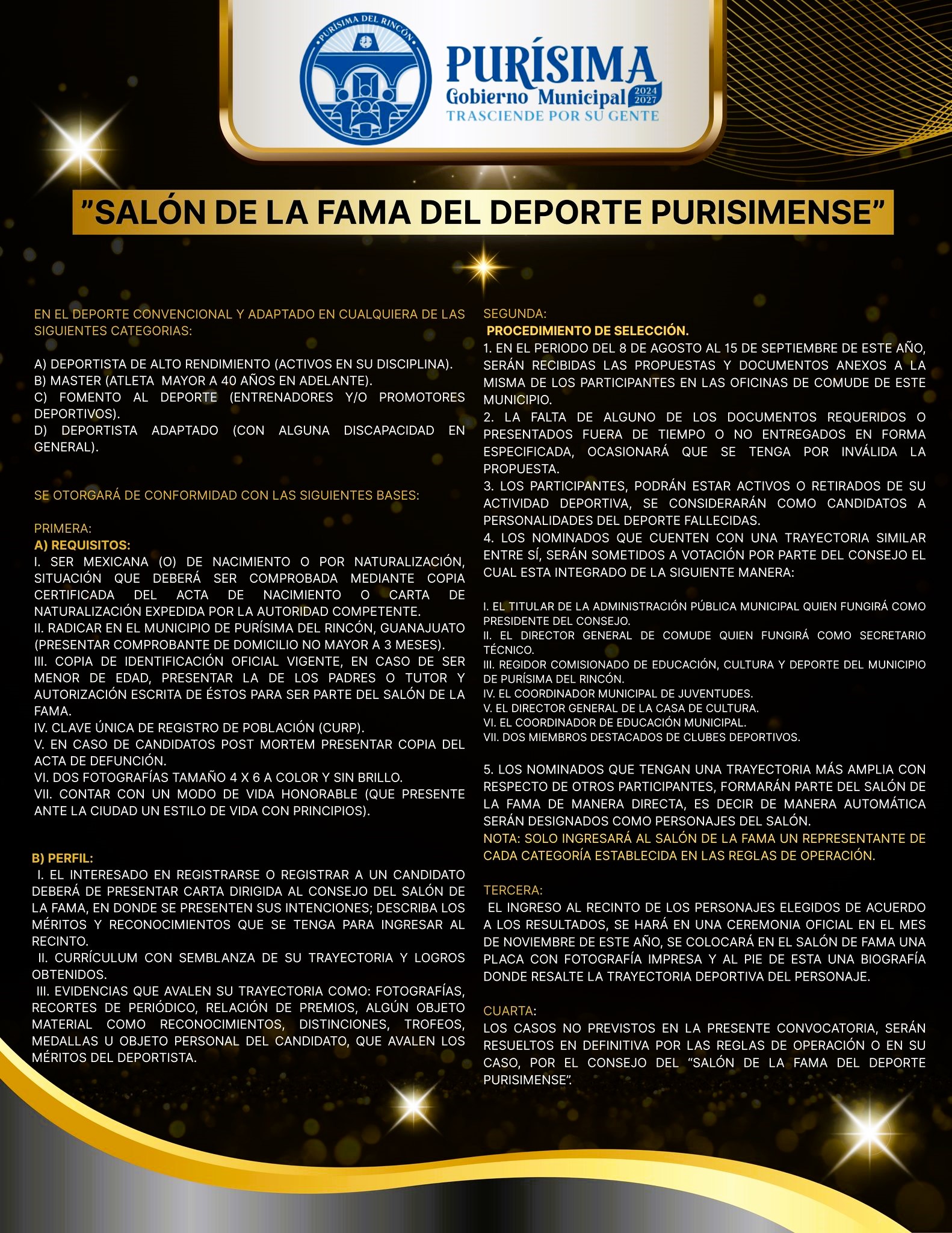 Entre los requisitos se solicita ser de nacionalidad mexicana o tener una residencia mínima de cinco años en Purísima del Rincón. Además, se deberá presentar una propuesta por escrito, un currículum deportivo y evidencias que respalden la trayectoria del candidato, como recortes de periódicos, diplomas, fotografías y medallas.