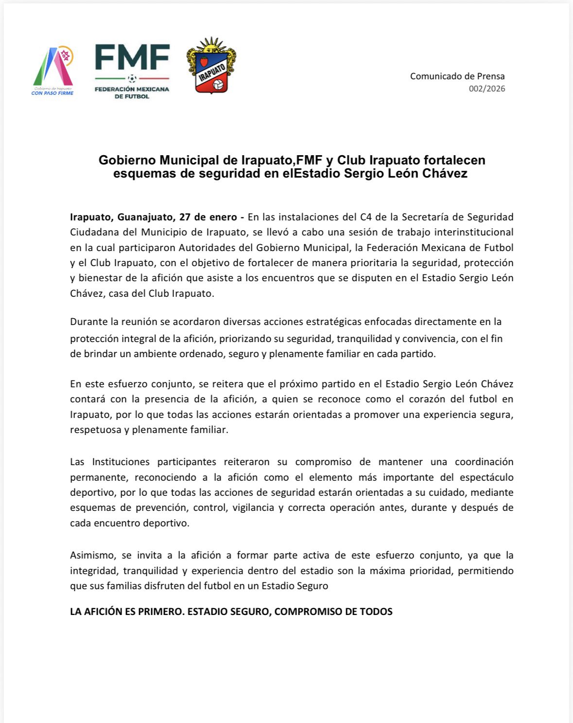 “Se acordaron diversas acciones estratégicas enfocadas directamente en la protección integral de la afición, priorizando su seguridad, tranquilidad y convivencia, con el fin de brindar un ambiente ordenado, seguro y plenamente familiar en cada partido… Se reitera que el próximo partido en el Estadio Sergio León Chávez contará con la presencia de la afición, a quien se reconoce como el corazón del futbol en Irapuato”, se lee en el comunicado.