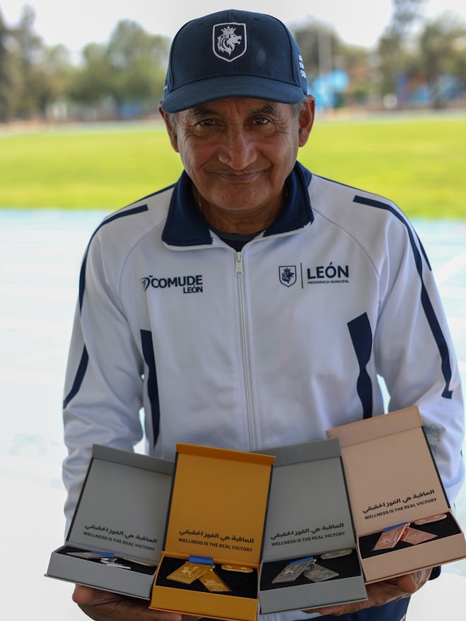 León, Guanajuato.- Juan Velázquez Sandoval, atleta originario de León, Guanajuato, regresó cargado de medallas tras su participación en los Open Masters Games 2026, celebrados en Abu Dhabi, donde compitieron más de 20 mil deportistas de 144 países.