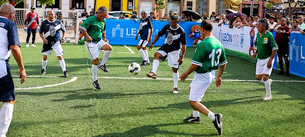 León, Guanajuato.- Como parte de las actividades de Semana Santa, veteranos del Club León, Unión de Curtidores y Búfalos Curtidores disputaron este miércoles un partido de exhibición en la cancha instalada en Plaza Expiatorio, ante la mirada de familias que disfrutaron de un ambiente festivo y nostálgico.