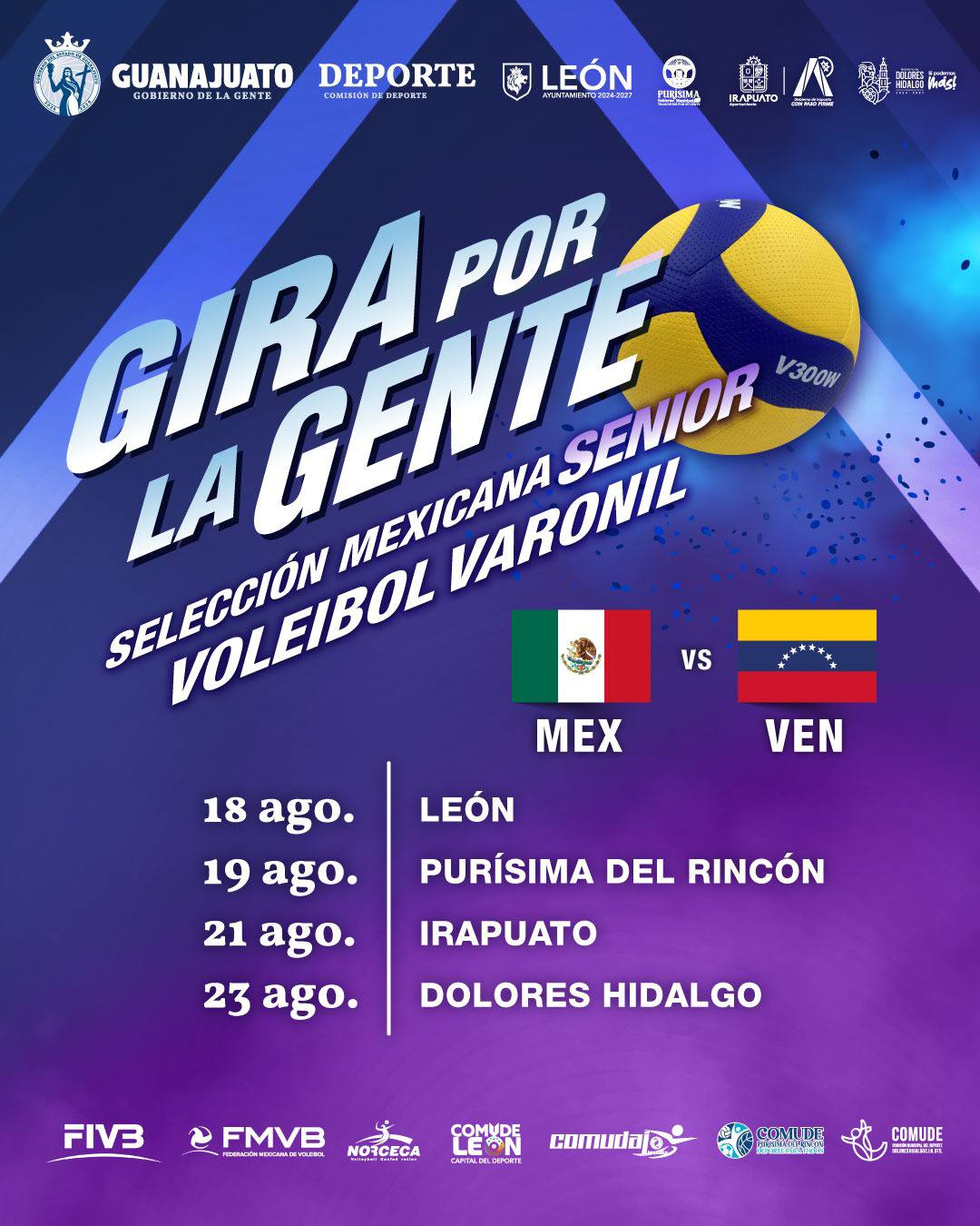León, Guanajuato.- Las selecciones varoniles de voleibol de México y Venezuela sostendrán una serie de partidos amistosos del 18 al 23 de agosto en cuatro municipios de Guanajuato, como parte de la «Gira por la Gente» que busca acercar el deporte de alto rendimiento a los guanajuatenses.