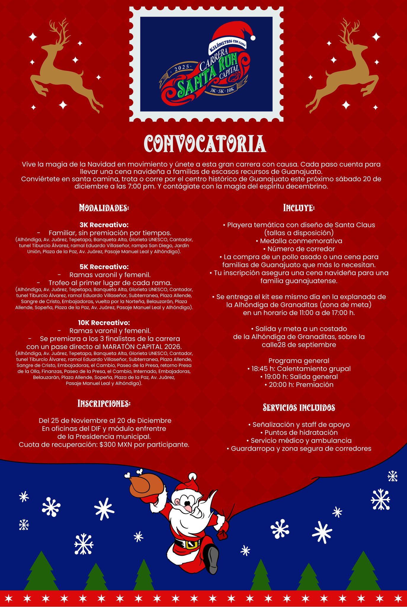 Guanajuato, Gto.– Con el objetivo de promover la activación física y, al mismo tiempo, apoyar a las familias guanajuatenses vulnerables en esta temporada decembrina, fue presentada la Santa Run Capital 2025, una carrera con causa impulsada por Saúl Navarro Smith, presidente del DIF Municipal. El evento busca reunir a cientos de corredores en el corazón de la ciudad y se ha consolidado como una de las actividades navideñas más esperadas por su sentido solidario y su ambiente familiar.