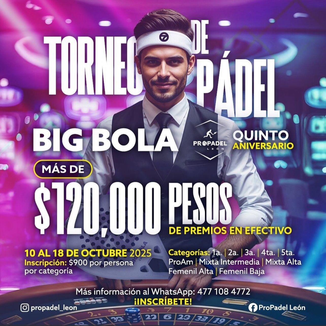 León, Guanajuato.- ProPádel León, en colaboración con Big Bola Casinos y Hyundai Bajío, realizará del 10 al 18 de octubre el Torneo Big Bola-ProPádel 2025 en sus instalaciones del bulevar San Juan Bosco, como parte de la celebración de su quinto aniversario.