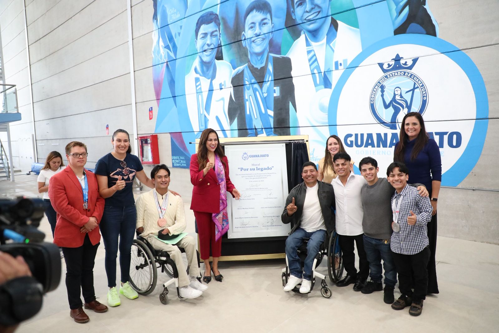 Los grandes de la natación en Guanajuato: Liliana Ibáñez, la nadadora más veloz de México, Celia Pulido, los paranadadores Raúl, Juan José y Jesús Alberto Gutiérrez Bermúdez, los paralímpicos Ángel Camacho, Jesús Hernández Hernández y el multimedallista de mundiales de Trisomía 21, Steven Martínez Arellano, firmaron una placa conmemorativa que acompaña el mural elaborado como homenaje a su trayectoria.